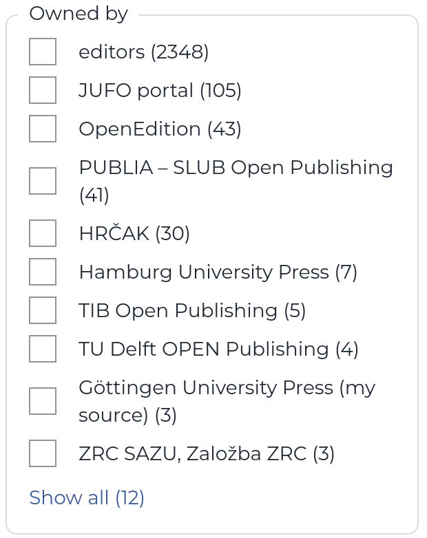 The representatives of trusted data sources (as well as all the other user groups) can use the “owned by” filter to view their own journals, or the journals owned by others separately.